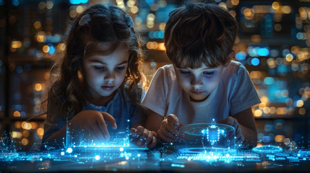 Step into a futuristic digital classroom where students, as glowing holograms, embrace virtual lessons Witness holographic learning revolutionize pedagogy, creating an interactive and immersive experience This innovative environment showcases how technology fosters awareness and education in the online age, paving the way for advanced, digital learning methodologies for the modern AI Generative