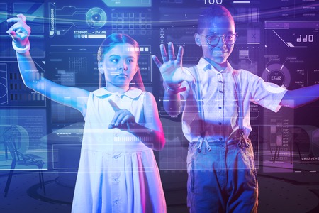 Clever kids. Smart progressive boy and girl standing together in front of a futuristic device and touching the transparent screen of it