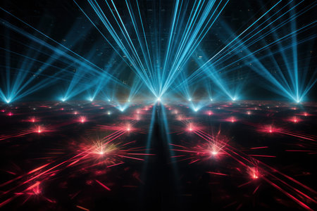 In a dimly lit space, a man stands confidently among striking blue laser beams that radiate in various directions. The vivid lights create a captivating and futuristic ambiance.