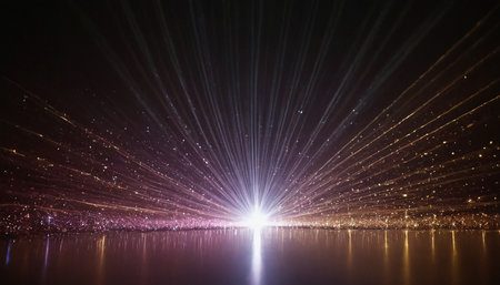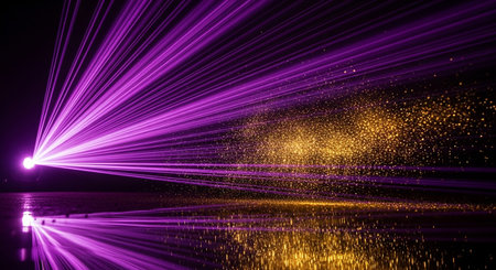 Abstract image of a laser show on the water. Laser rays make their way through the water.