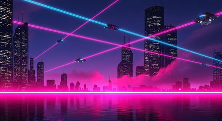 A breathtaking cityscape at night, featuring brilliant blue laser beams cutting through the dark sky, creating an energetic and vibrant atmosphere perfect for urban-themed designs.
