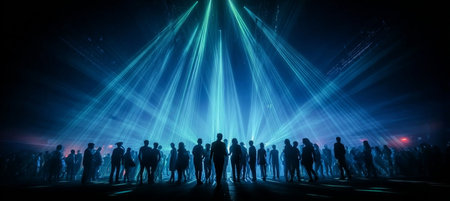 Fun in night club with laser light. Silhouetted Figures at Futuristic Light Show with Glowing Particles