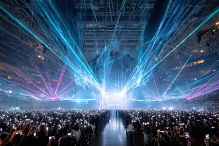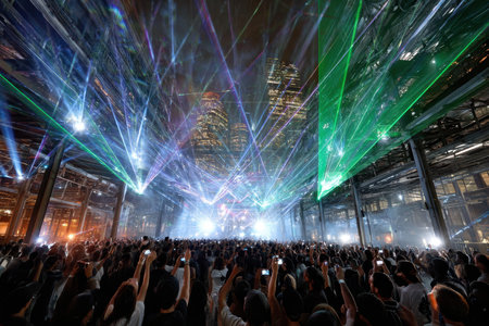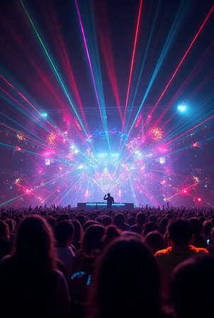 A lively concert audience enjoys a spectacular laser light show, creating an energetic atmosphere.