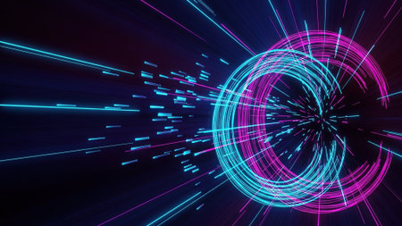 3D render, Light speed or high speed warp trails, motion effect movement technology background, abstract futuristic neon light.