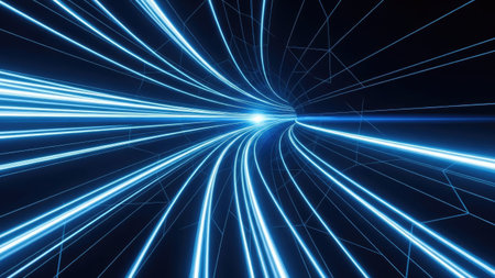 Fast speed tunnel with rushing digital particles information flow concept cyberspace visualization futuristic circuit elements