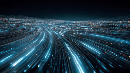 Exploding wave of luminous blue particles in motion against a dark background, resembling data streams or energy flows.