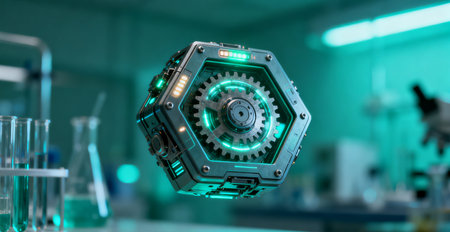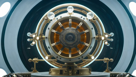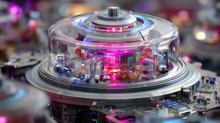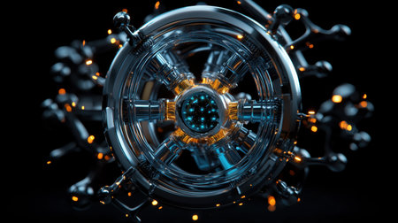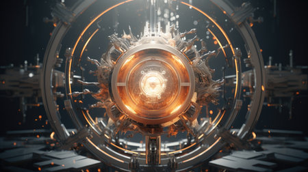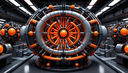 This visually striking image showcases a futuristic circular device adorned with glowing orange lights, surrounded by transparent cylinders, set against a dark background.