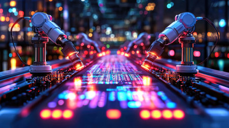 A futuristic scene featuring an advanced robotic arm operating precision machinery surrounded by neon lighting. Ideal for technology and automation themes.