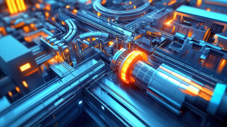 A captivating futuristic industrial scene showcasing advanced machinery, illuminated components, and intricate designs. The smooth reflections enhance the dramatic atmosphere.