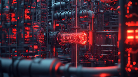 A striking visualization of futuristic industrial machinery combining intricate pipes and neon red accents, showcasing advanced technology and modern design.