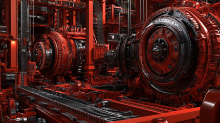 This image features a vibrant red industrial mechanical environment, showcasing advanced machinery with intricate details and geometric structures. Perfect for technology themes.