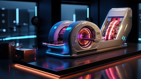 A stunning depiction of a futuristic engine featuring vibrant neon lights and intricate mechanical details, set in a high-tech sci-fi environment.