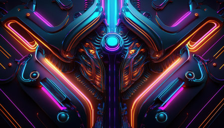 Intricate patterns and colorful neon lights combine in a modern industrial artistic creation.