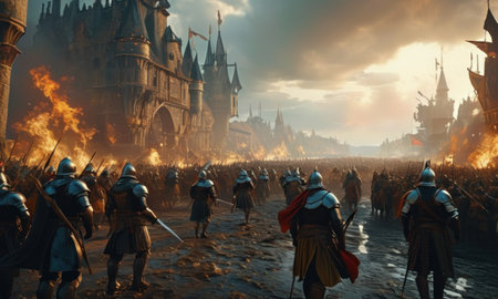 Medieval knights army in full armor standing in formation ready for battle. Warrior on battlefield