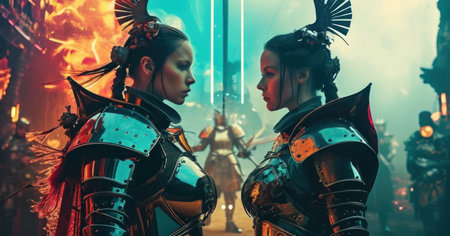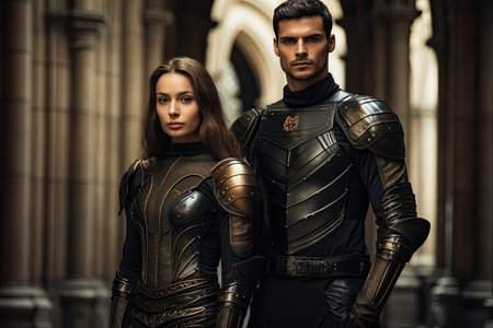 Middle Ages. A beautiful and strong woman knight in armor holds a tender white rose in her iron gloves. Copy space.