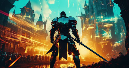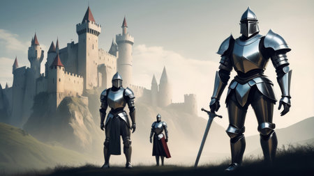 A knight in shining armor stands before ancient castle ruins, surrounded by nature, a breathtaking blend of history and fantasy. Generated A.I.