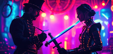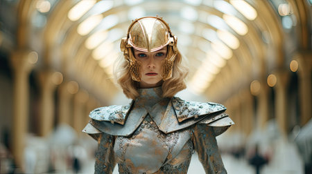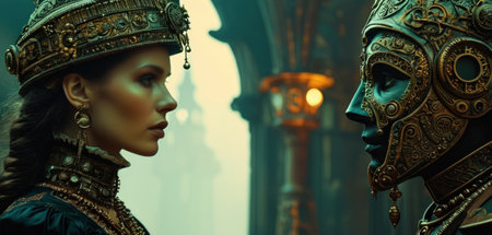Portrait of a beautiful steampunk woman in a medieval palace.