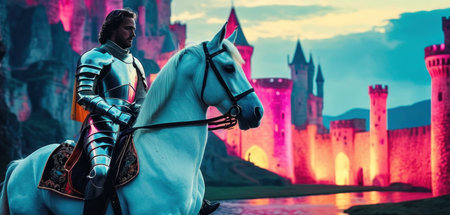 The noble knight in armor knelt down and raised his sword, looking at the light in the castle. Romance.