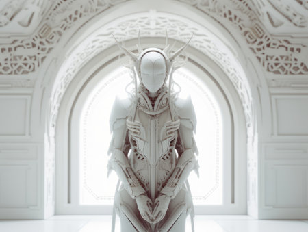A futuristic female mannequin in a white dress and mask stands in a futuristic white room interior. Symmetrical composition. Created with Generative AI technology.
