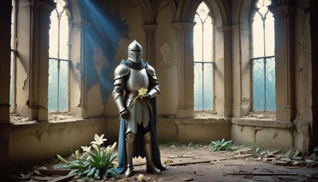 in the quiet of ruined chapel, a knight in rusted armor contemplates a single white lily
