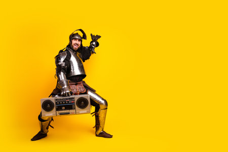A knight in full armor holding a retro boombox on a vibrant yellow background