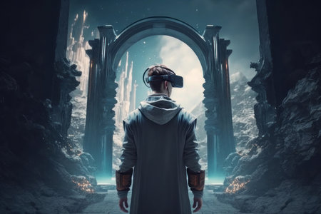 A man in virtual reality glasses in a virtual fantasy world. AI generative. illustration in photorealistic style.