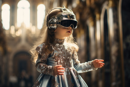 Princess girl wearing VR headset user, surreal world and virtual reality, colorful flowers fields. Generative AI
