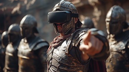 Portrait of one brutal bearded man, medeival warrior or knight in VR glasses with sword over dark background.