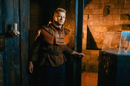 Portrait of a brave medieval warrior in armor looking at his sword. The Witcher man.