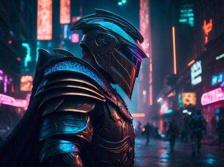 Futuristic robot knight guarding stone castle with glowing red eyes and spear