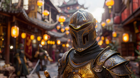 Virtual Reality Explorer, Medieval Armor, Adventurer, In a bustling marketplace, The glow of lanterns, 3D render, Golden Hour, Depth of Field Bokeh Effect, Wide-angle view