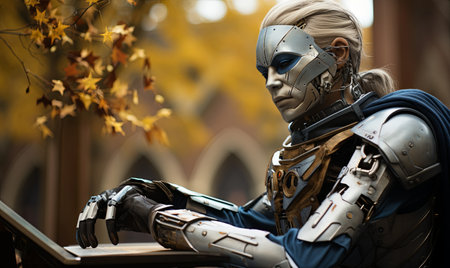 A striking armored figure with a sleek design poses in a historic location as evening approaches.