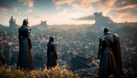 The fictional tree characters with armor standing atop a mountain peak, gazing out at a majestic cityscape comprised of tall, grand castles