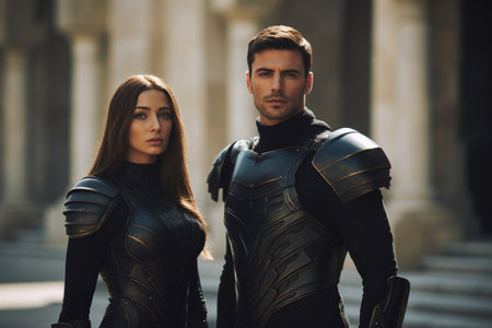 Two armored knights stand confidently in a modern city environment, showing their intricate armor details.