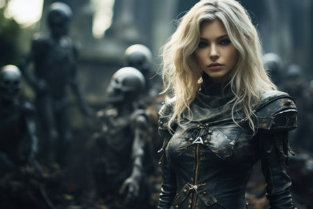 photo of strong ancient young female warrior with roman armor stained, generative AI