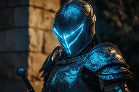 A knight in shining armor with a glowing blue visor stands watch near a stone castle at night.
