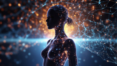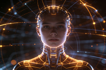 This striking image showcases a futuristic human figure composed of digital circuits and light particles, symbolizing the intersection of technology and humanity.