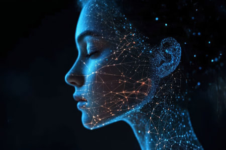 Digital Polygonal Face - A human face constructed from intelligent geometric shapes with visible network connections.