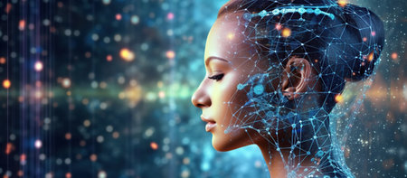 digital data deep learning ai robot bionic automatic face, technology network, cyberpunk futuristic concept, plexus cell brain, humanoid science