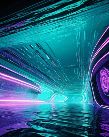 Motion showing endless dark tunnel illuminated by vibrant streaks of neon green blue and purple lights creating a sense of speed and motion with reflections...