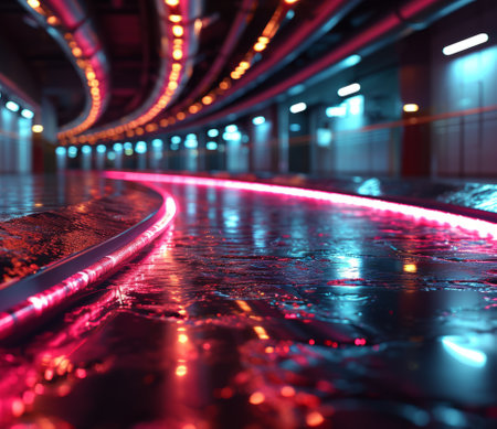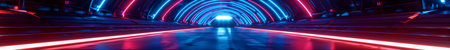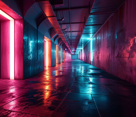 Futuristic neon-lit underground corridor featuring red and blue lighting.