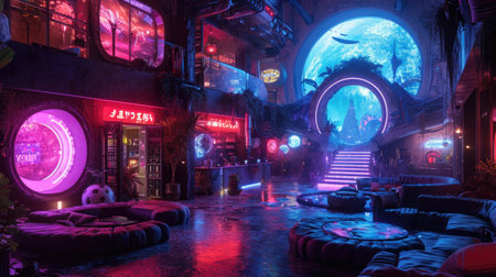 Generative ai. decoration interior bar or night club in neon blue and red lights. Party or nightlife entertainment.