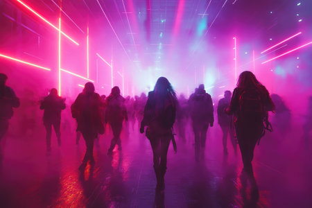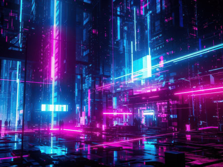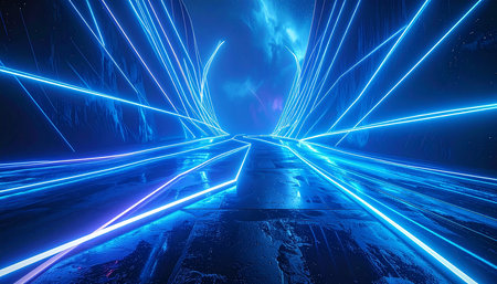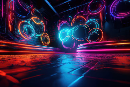 This digital artwork showcases a dynamic blend of neon colors and electric lighting, creating a futuristic and energetic mood. Perfect for enhancing nightlife and entertainment promotions, event posters, and digital media. The abstract style appeals to modern designers and marketers in the entertainment industry. AI-generated digital illustration. AI-generated illustration.
