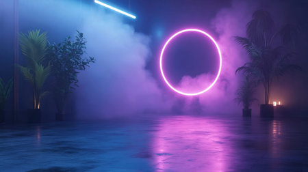 A vibrant neon circle glows amidst a misty, atmospheric scene, reflecting in a wet surface, creating a surreal and captivating visual.
