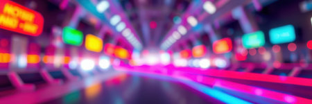 Bright neon lights illuminate an arcade with colorful displays in a bustling entertainment venue