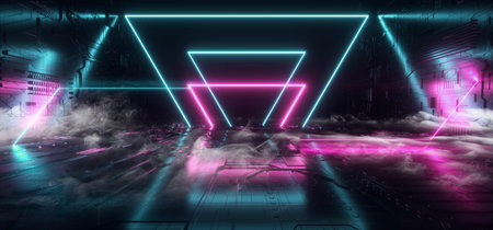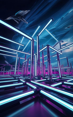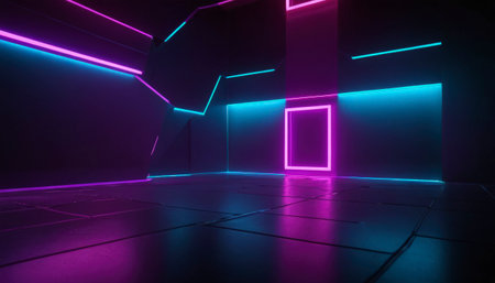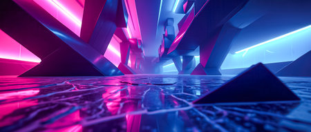 This composition features a dynamic abstract geometric environment, showcasing sharp angular shapes illuminated by bright neon lights in vivid shades of pink and blue, creating a futuristic ambiance.
