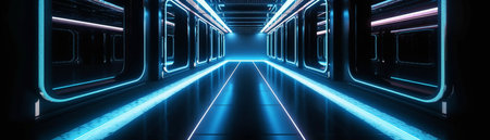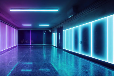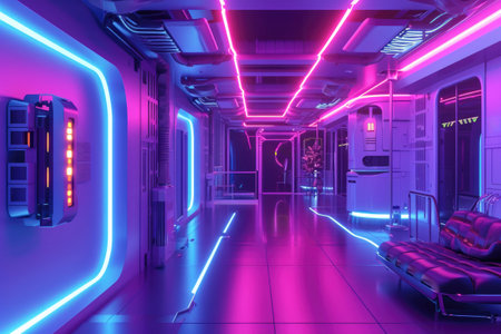 Sleek Neon Infused Futuristic Corridor Futuristic High Tech Architecture with Luminous Purple and Blue Lighting Creates an Immersive, Visually Captivating Environment