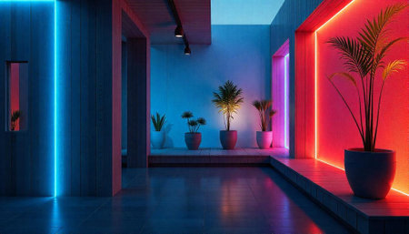 A neon lighting background featuring intersecting red and cyan beams, casting sharp, vibrant light across a dark, industrial setting.