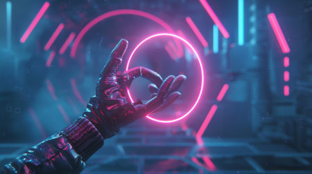 An abstract rendering of a mannequin hand holding a neon ring glowing pink and blue on a geometrical background. A futuristic wallpaper designed to depict future technology.