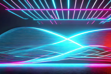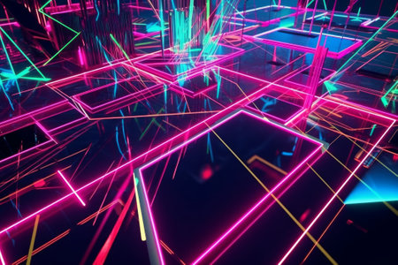 Abstract geometric lines with neon glow create a futuristic, digital grid.
